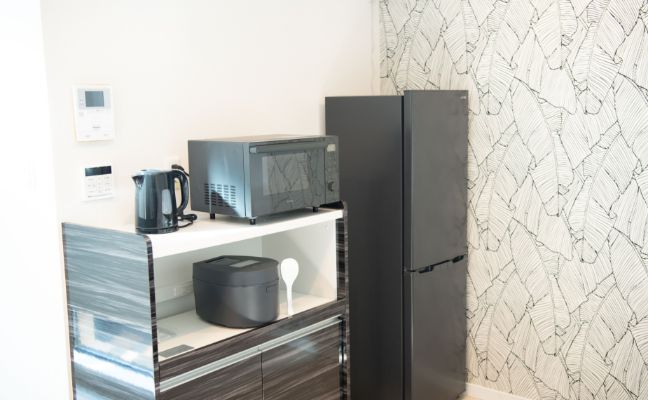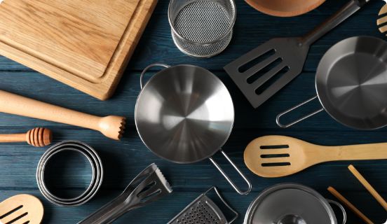 電気ポット、電子レンジ、フライパン、炊飯器、鍋、トング、お玉、ざる、包丁、オープナー、缶切りなど